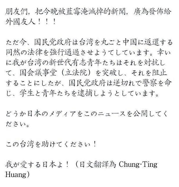”ただ今、国民党政府は台湾を丸ごと中国に返還する同然の法律を強行通過させようとしています。幸いに我が台湾の新世代有志青年たちはそれを対抗して、国会議事堂(立法院)を突破し、それを阻止することにしたが、国民党政府は逆ギレで警察を命じ、学生と青年たちを逮捕しようとしています。