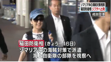 稲田防衛大臣は、就任後、初めての外国訪問として、ソマリア沖の海賊対策のために派遣されている海上自衛隊の部隊を視察するため、13日夜、自衛隊の活動拠点があるアフリカのジブチに向けて成田空港を出発しました。